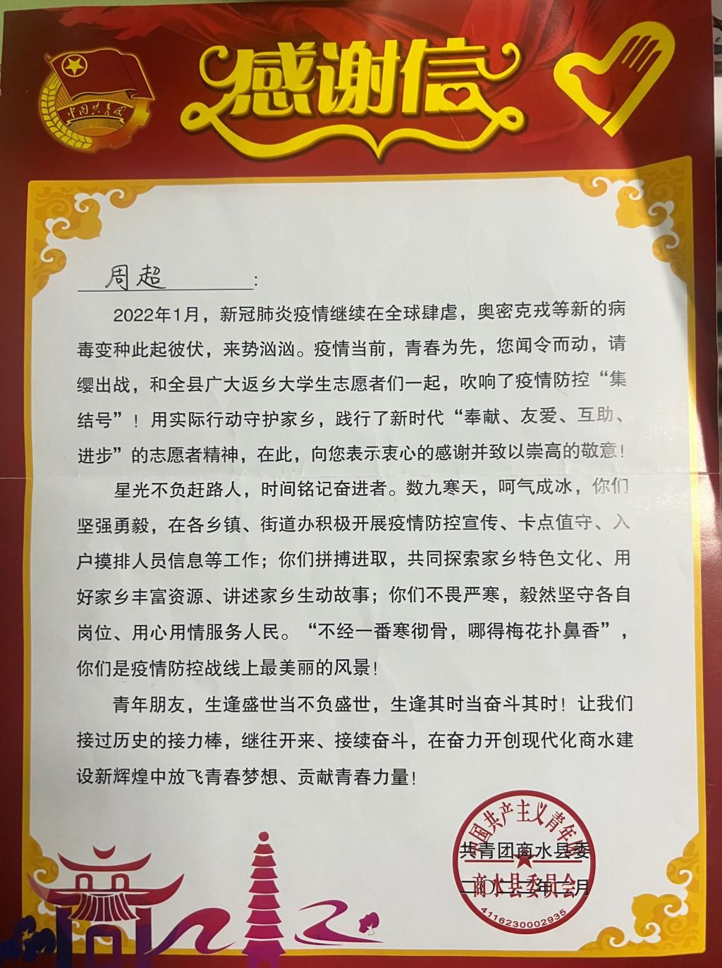 近日,我院收到来自河南省新乡市凤泉区委员会和共青团商水县委员会的两封感谢信,对疫情期间奋斗在一线的抗疫青年志愿者——花蝴蝶高清免费看片大全2018级数学与应用数学1班耿慧杰和2019级应用物理学1班周超两位同学进行表扬,对他们在抗击新冠肺炎疫情期间勇于付出、敢于担当、乐于奉献、履职尽责的精神表达由衷感谢和赞赏,并对学校的人才培养工作给予高度评价。