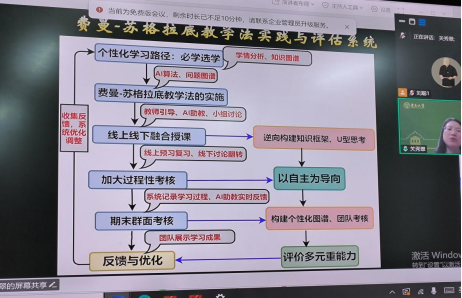 智慧树网基于关教授提出的“费曼-苏格拉底教学法实践系统”,为课程开发了一个课程智能体开展引导式学习。参会教师就公共基础课知识图谱的教学特点,知识图谱课程教学实施细节等问题进行交流研讨。刘聪从平台运营角度予以补充和回应。