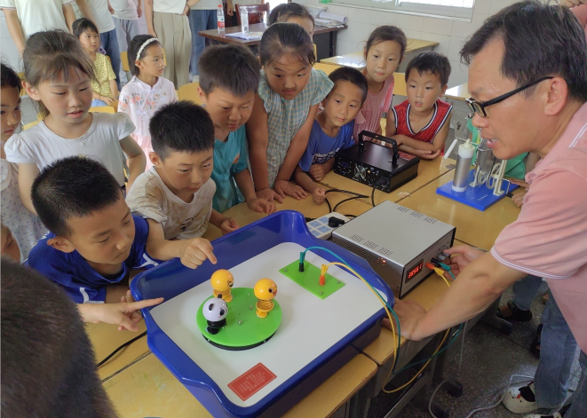 课堂上,同学们手摇发电机通过运转闪烁出细微亮眼的电光;变幻莫测的激光投影仪收到孩子们的注目礼;静电起电机使纸条缓缓悬浮在空中;共振小娃在不同频率下夸张舞动。学生们专心聆听老师的讲解,形式新颖的课堂吸引着每个学生的目光,充分让学生感受到了科学的奇妙。