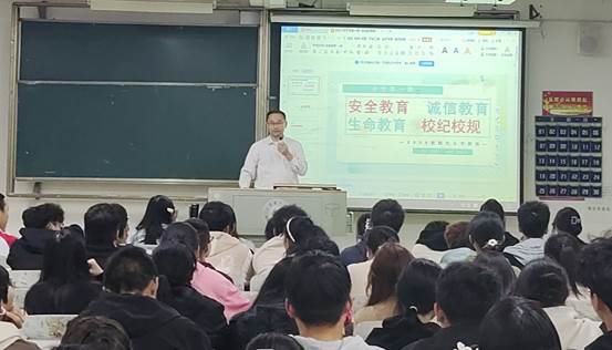 学院党总支副书记汪宏志从国家安全、交通安全、食品安全、财产安全、人身安全以及心理安全等方面为新生做安全主题教育,提醒大家增强安全意识,遵纪守法,诚信为人,努力拼搏,珍惜时光。