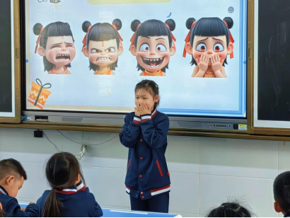 “当你收到生日礼物时,会变成哪种颜色?”主讲人小秦姐姐通过播放电影《头脑特工队》的片段,带领小朋友一起走进情绪的世界。接着,小秦姐姐展示了哪吒的表情包,并引导大家思考:“小朋友们,这是你们最喜欢的哪吒吗?你们猜猜看,此刻哪吒的情绪是什么样的?。”小朋友们踊跃发言,答案五花八门的。随后,小秦姐姐邀请了几位小朋友上台,模仿表情包里哪吒的情绪状态。有的小朋友双手叉腰,怒目圆睁,生动演绎哪吒生气的模样;有的则嘴角上扬,摇头晃脑,表现出哪吒得意的神情。最后,小齐哥哥和小赵哥哥带领小朋友们进行互动游戏——“情绪猜猜猜”和“大风吹”。这些游戏不仅让小朋友们在轻松愉快的氛围中加深对情绪的认知,还有效提升了他们的情绪表达能力。