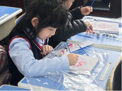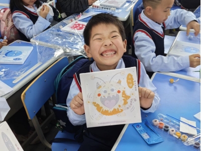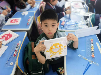手工环节迎来最热烈的创作时刻。孩子们手握油彩笔,在画纸上释放情绪能量:红色锯齿线勾勒生气的火焰,蓝色涟漪波纹描绘雨天的心情,黄色星星点点洒落快乐的印记。小菲姐姐穿行在课桌间指导创作,“这是会喷火的小怪兽吗?”“看这片粉色云朵是不是害羞的表情?”引发阵阵欢快回应。当“3、2、1!”的倒计时响起,50双小手齐齐高举画作,镜头定格下漫天挥舞的“情绪小怪兽”。