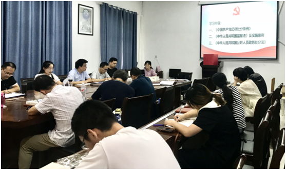 扎实开展纪法专题教育学习活动。学院第一党支部书记王玉芳带领全体党员认真学习《中国共产党纪律处分条例》、《中华人民共和国监察法》及实施条例、《中华人民共和国公职人员政务处分法》等规章制度,并进行深入讲解,引导全体党员学法、懂法、守法。