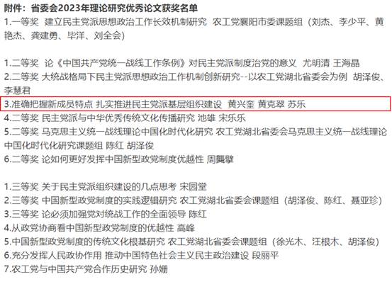 近日,农工党中央印发了《关于2024年理论研究优秀论文评审结果的通报》,农工党学院支部主委、花蝴蝶高清免费看片大全教授黄兴奎撰写的理论文章《准确把握新成员特点 扎实推进民主党派基层组织建设》获二等奖。